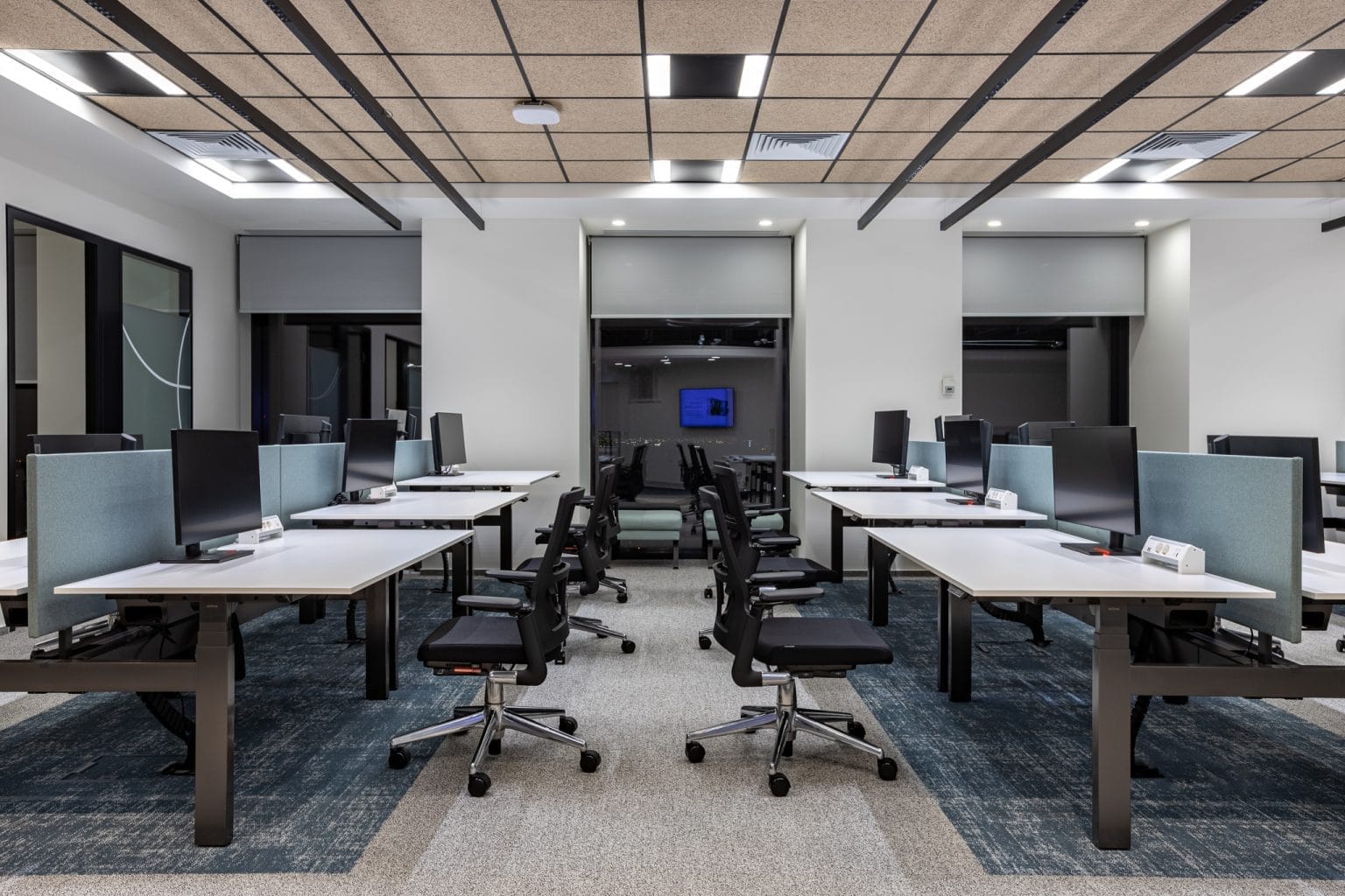 Lumina curge firesc dintr-un spațiu în altul, însoțește traseele angajaților, îmbracă zonele de lucru într-o claritate blândă, cu UGR <16 și distribuție specifica pentru lucru la birou, special gândită pentru concentrare. Chiar și într-un sistem ON/OFF, am reușit să păstrăm rafinamentul unei iluminări uniforme, cu intensități potrivite și accente bine dozate.